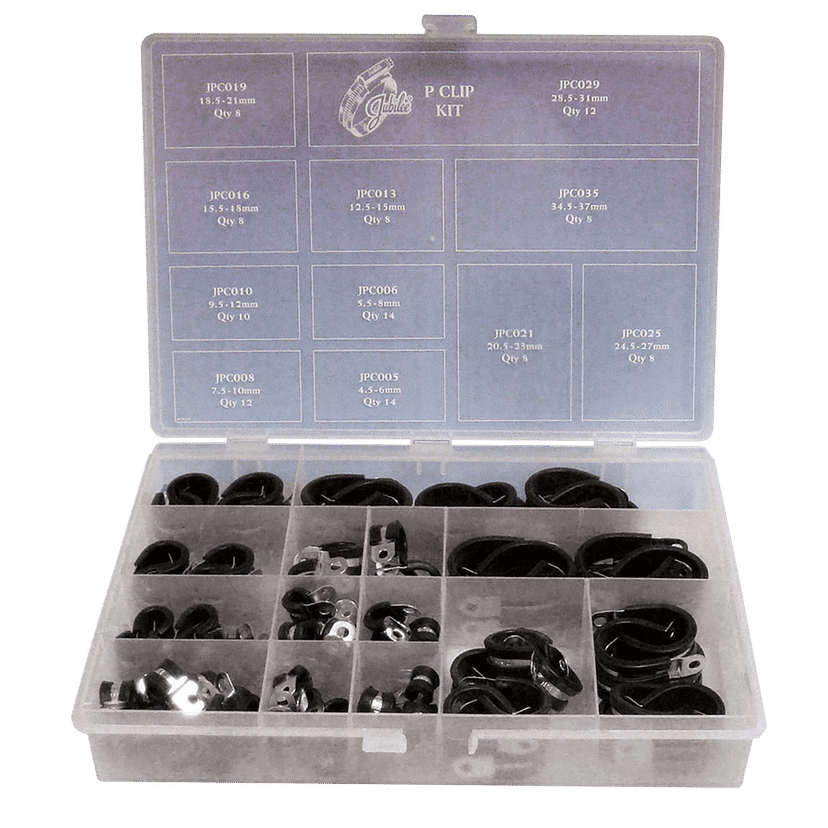 Contains 110 x P clips of the most accepted sizes in a versatile, re-usable plastic container suitable for any challenging enviroment. Jubilee® P clips are manufactured from one piece of steel band with an EPDM rubber liner.