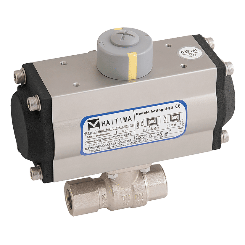 3/8" BSP Parallel, 2 Piece Ball Valve Fitted with a Pneumatic Actuator, Double Acting, Nickel Plated Brass Valve Material, Elastomer Seal Material, Valve Working Temperature -20°C to +130°C, Actuator Working Temperature -20°C to +90°C, Valve Maximum Working Pressure 40 bar, Haitima